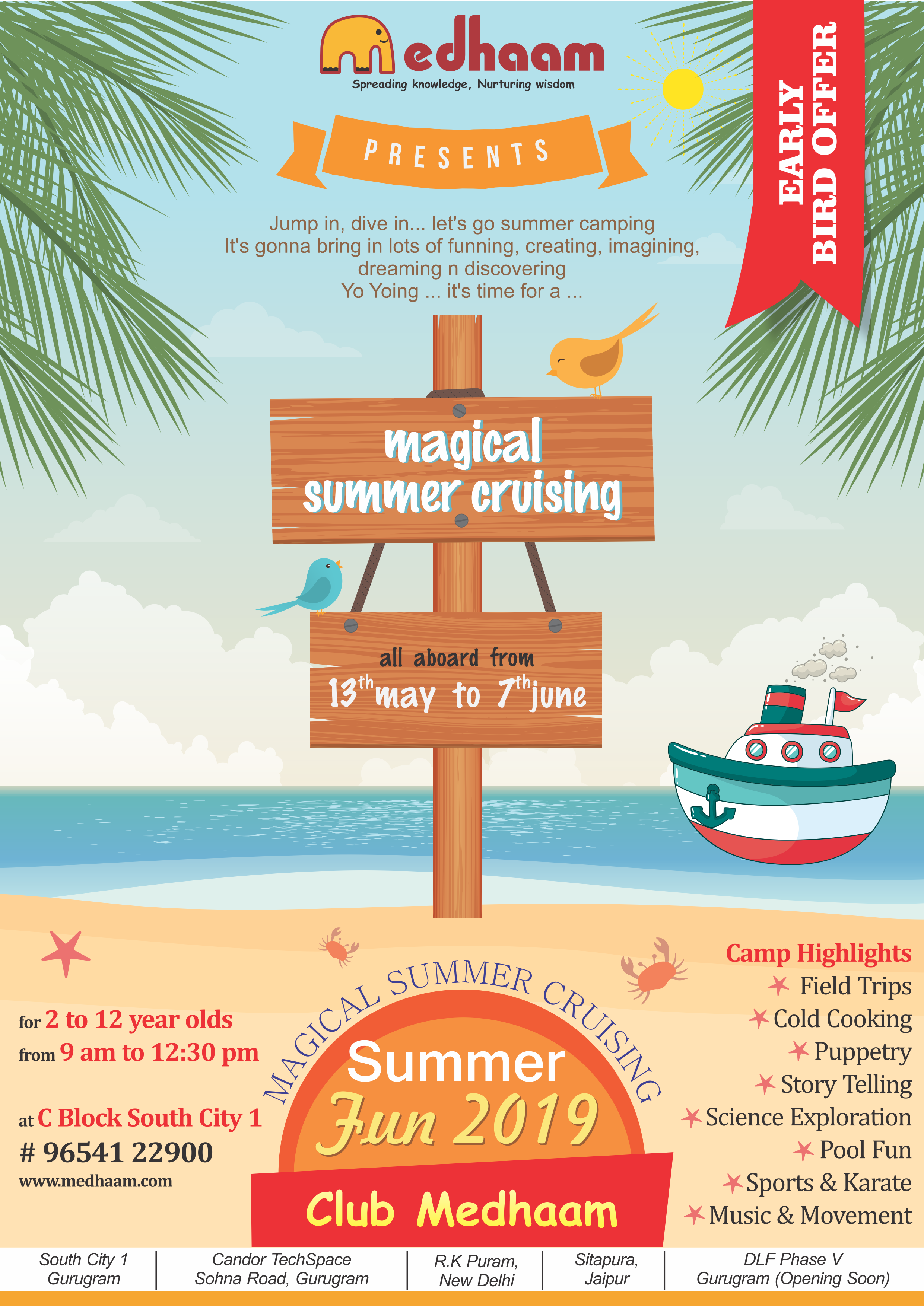 Fun. Our darling Medhavis will indulge in this absolutely fantastic summer fun experience featuring daily exciting new themes which will be explored through stories, art, games, music, dramatic play, physical activities and water play. Lots of fun and exciting awaits our little campers at this daily whirlwind called \'Magical Summer Cruising\'. With experienced